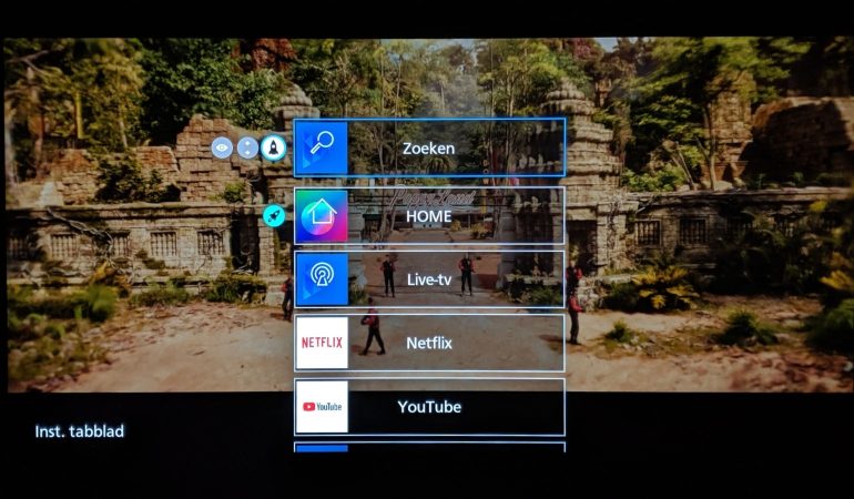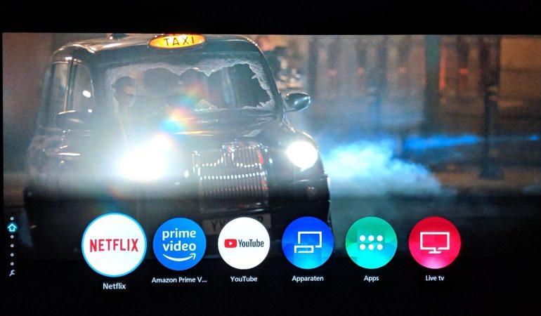 De smart tv omgeving daarentegen is bijzonder handig en overzichtelijk. De Home toets toont een lijst met mogelijkheden onderaan het scherm, in een balk. Aanvankelijk vind je hier een icoon voor alle ingangen, de live tv zenders en de apps. Ook de iconen voor Netflix, YouTube, en Amazon Prime Video zijn van bij de installatie beschikbaar. De interface neemt weinig plaats op het scherm en je kunt ongestoord verder kijken.