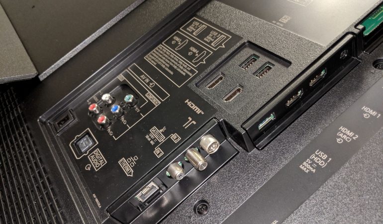 Aan de zijkant zitten de netwerkaansluiting, drie antenne aansluitingen, een extra USB aansluiting en de hoofdtelefoonaansluiting. Die laatste kan je ook gebruiken om een externe subwoofer aan te sluiten, die functie activeer je dan via het menu. Een afneembaar paneel verbergt alle aansluitingen, maar vermits er maar twee HDMI-aansluitingen opzij staan zal dat voor heel wat gebruikers geen optie zijn. Alle aansluitingen achteraan wijzen naar de muur, opgelet dus bij wandmontage.