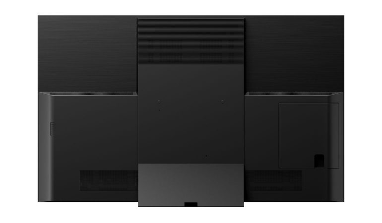 Het volledige toestel is uitgevoerd in het zwart. Een donker metalen lint beschermt het supersmalle OLED-scherm rondom rond tegen stootjes. Onderaan het scherm is de soundbar zichtbaar, al valt die niet echt op dankzij de donkere grille. De achterzijde is op dit model mat egaal afgewerkt, zonder een duidelijke structuur. Een afneembare cover verbergt de voet. Maar het meest opvallend aan de achterzijde zijn uiteraard de opwaarts gerichte ingebouwde speakers. Ze maken het profiel van het toestel iets dikker, maar dat valt van voor bekeken en zelfs van opzij bekeken nauwelijks op.