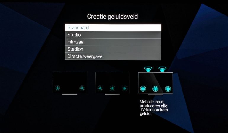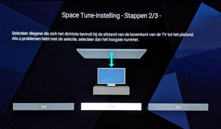 Aan vermogen ontbreekt het niet, de upfiring speakers zijn elk goed voor 20 Watt, en de soundbar onder het scherm levert nog eens 100 Watt, een totaal van 140 Watt. Tijdens de installatie doorloop je de ‘Space Tune’ instellingen waarin je opgeeft hoe de televisie opgesteld staat. Indien gewenst kan je die later nog aanpassen.