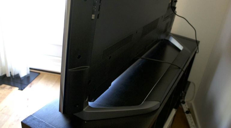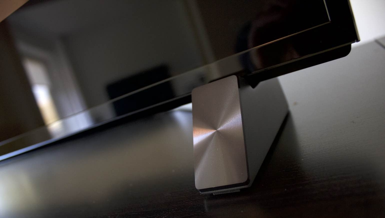De voorzijde van de voet bestaat uit twee kleine pootjes met een donkere afwerking van geborsteld metaal. Dit is dan ook het enige dat opvalt aan de voet, wat de ‘look’ van de tv ten goede komt. Dat de tv iets nodig heeft om stevig te kunnen staan is overigens niet vreemd. Dit model is namelijk een stuk dikker en zwaarder dan de gemiddelde lcd led tv, en dat komt door de direct led achtergrondverlichting waarbij de led’s zich direct achter het scherm bevinden.