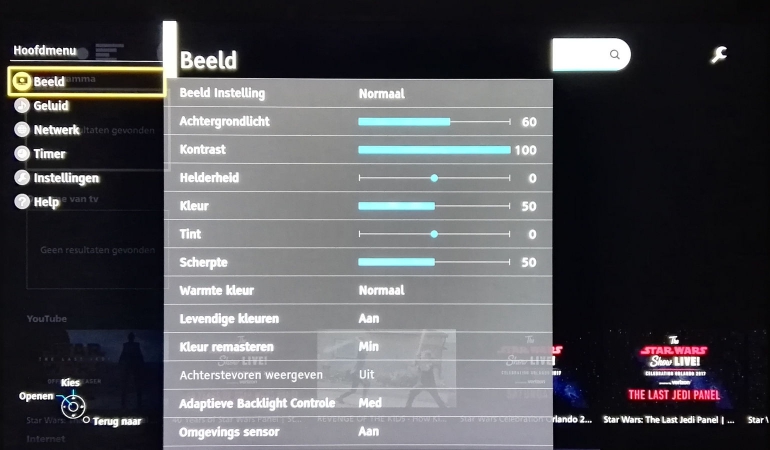 In ons artikel over het professioneel kalibreren van een tv lees je alles over de mogelijkheden om met een professional tot de beste beeldinstellingen te komen. Wil je zelf aan de slag gaan, neem dan onze home cinema informatiegids door. Hier vind je een uitleg over de belangrijkste beeldinstellingen en tips voor het instellen van je tv. Met de basisinstellingen zijn we tot onderstaande settings gekomen voor deze tv.