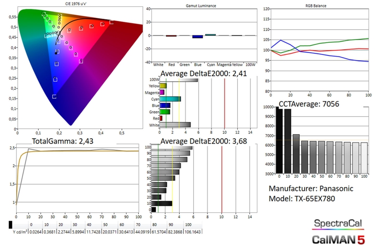 De kalibratie in de True Cinema mode is erg goed. Het kleurbereik en de kleurweergave zijn absoluut uitstekend. Enkel de grijsschaal wijkt in de lichtste tinten zachtjes uit naar geel. In de donkerste tinten is ze iets te blauw. Dat is voor Panasonic een eerder matig resultaat, maar gelukkig is de fout klein genoeg om zelden of nooit zichtbaar te zijn.