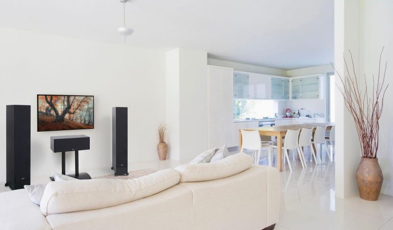De 20-kg wegende 6000F-vloerstaanders die hier links en rechts vooraan (of de stereokanalen) voor hun rekening nemen zijn behoorlijk forse luidsprekers van 105 × 23 × 36 cm. Ze hebben naast een tweeter ook vier grote drivers (drie woofers, één midrange) van elk 140 mm diameter, met 3 baspoorten aan de achterkant. Dat maakt deze Monitor SE-vloerstaanders speakers die gevoelig zijn voor de plaatsing ten opzichte van de muur. We zouden toch aanraden een zekere afstand van de muur aan te houden. Zoek je trouwens compactere vloerstaanders, dan is er nog de kleinere SE 3000F.