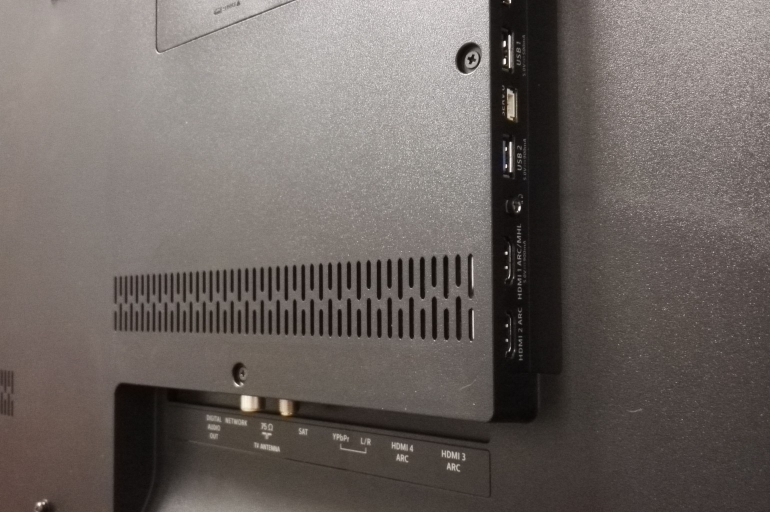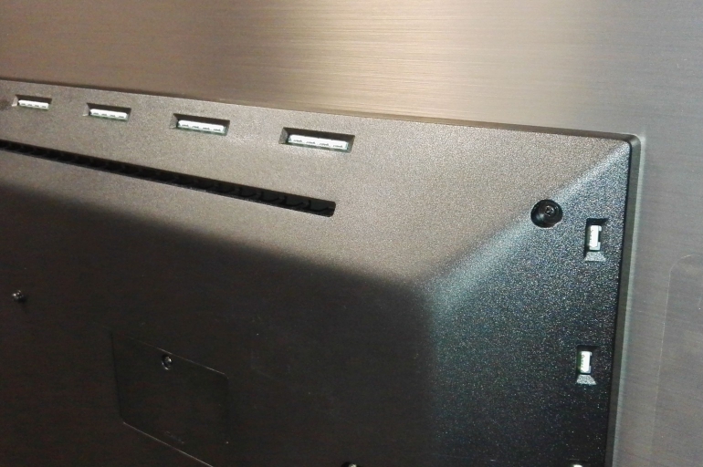 Aan de achterzijde is enkel de rug van het scherm nog metaalkleurig. Het dikkere deel dat de Ambilight leds, aansluitingen en elektronica bevat is in eenvoudig zware plastiek uitgevoerd. Een deel van de goedkopere prijs lijkt ons dus zeker op conto van het eenvoudigere design te komen.