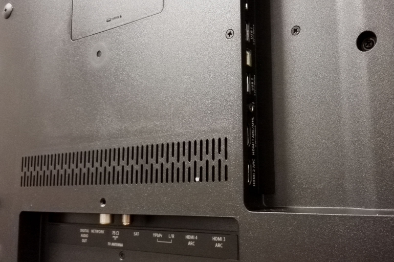 Achteraan vinden we twee HDMI-aansluitingen, de antenneaansluitingen, een optisch digitale uitgang, component video en stereo cinch ingang en de bedrade netwerkaansluiting. Aan de zijkant twee extra HDMI-aansluitingen (deze zijn voorzien van HDCP 2.2 voor Ultra HD-bronnen), twee maal USB (1x v3.0) en de hoofdtelefoonaansluiting.