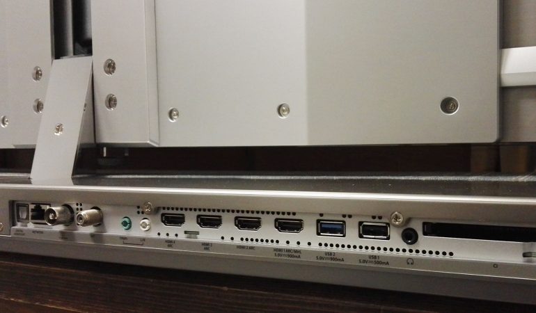 De aansluitingen bevatten geen verrassingen. Zoals gezegd zitten ze in de voet, en wijzen ze allemaal naar de achterwand. Dat kan tijdens het opstellen wat problemen veroorzaken als je het scherm te dicht tegen de muur zet. De aansluitingen staan redelijk in het midden van het scherm, en achter een 65 inch scherm reiken om een kabel in te pluggen is een uitdaging.