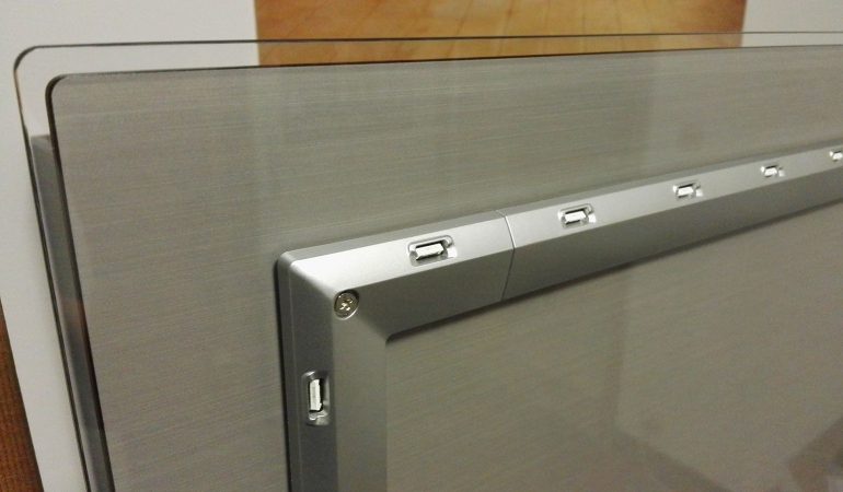 De meest in het oog springende keuze hebben we voor het laatst gehouden. Het toestel is voorzien van een soundbar die verwerkt zit in de voet. De voorzijde van de soundbar is bekleed met een mooie grijze stof, en de rest van de voet is net zoals het scherm afgewerkt in metaalgrijs. De voet/soundbar zit vast aan het toestel maar kan ook gekanteld worden in geval je het scherm aan de muur wenst te bevestigen.
