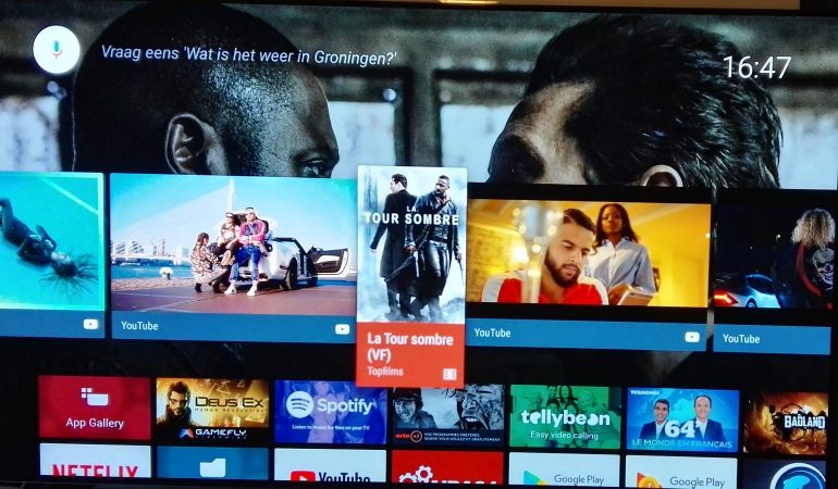 De interface van Android TV (Nougat) is nog steeds onveranderd. Het Home scherm neemt heel het scherm over, al zie je op de achtergrond wel waar je naar keek. Aanbevelingen staan prominent bovenaan, en daaronder verschillende rijen met apps en tv-functies. Onderaan een rij met instellingen.