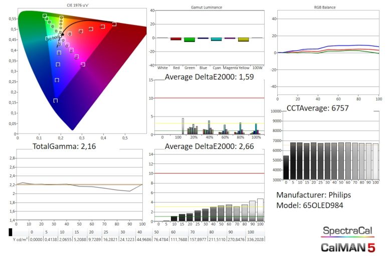 De OLED984 is in de ‘Films’ beeldpreset uitstekend gekalibreerd. Deze instelling mikt met een gammawaarde van 2,2 en een redelijk hoge maximale helderheid eerder op een mooie filmervaring bij wat omgevingslicht. Voor kijken bij verduistering, laat je ‘Contrast’ zakken naar 30 (of activeer je de lichtsensor) en trek je ‘Gamma’ op naar +2. Opnieuw zien we dat de weergave van schaduwnuances goed verbeterd is. De kleurweergave is uitstekend en flirt met het referentieniveau. Huidstinten zijn perfect. Het OLED-paneel toonde lichte verticale banding in de allerdonkerste testbeelden (1% en 2%), dat kan verschillen van toestel tot toestel. In de praktijk stoorde dat nooit.