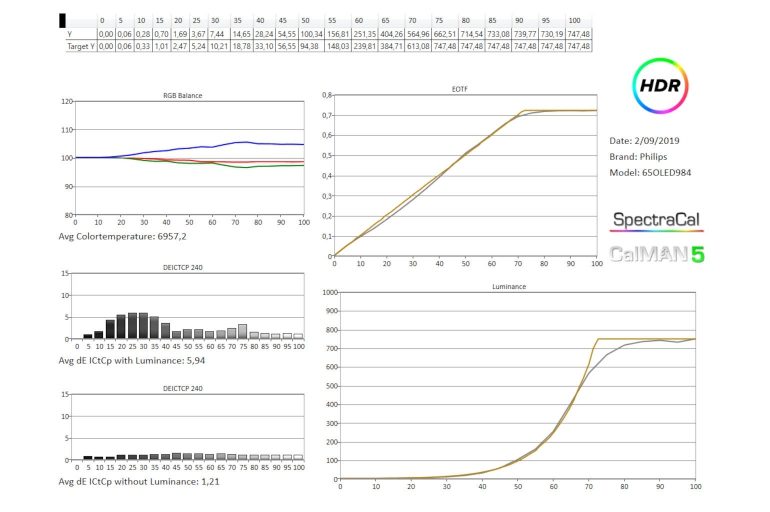 De ‘HDR Films’ beeldpreset is goed gekalibreerd al zien we ook op dit toestel de typische keuzes die Philips maakt. Hij negeert alle metadata, en je kunt de helderheidscurve licht manipuleren met behulp van de ‘HDR Perfect’ instelling, ze staat standaard op Minimum. In die stand worden donkere tot middentonen (0 – 200 nits) correct getoond, en rolt de helderheidscurve zacht af naar het maximum met alle witdetail zichtbaar tot ongeveer 3.000 nits, een uitstekende prestatie die dicht tegen referentieniveau aan zit. Door ‘HDR Perfect’ aan te passen ruil je in essentie helderheid van het beeld voor meer witdetail. In de ‘Uit’ stand zie je alle witdetail tot 4.000 nits, maar is het beeld wat donkerder. In de hogere standen wordt het beeld wat helderder, maar verlies je witdetail, bijvoorbeeld in de maximale stand is alles boven 2.000 nits weg geclipt. ‘Minimum’ lijkt ons daarom de beste stand.