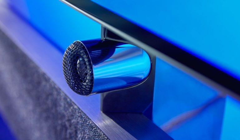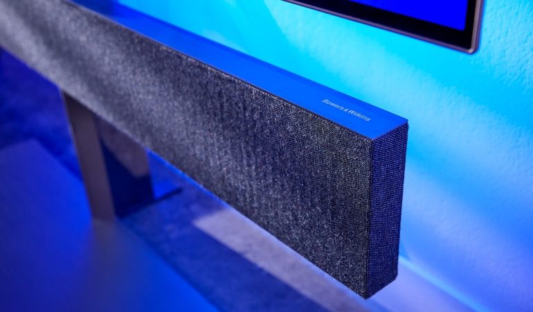 Bowers & Wilkins ontwierp de volledige soundbar onder deze televisie. Meest in het oog springend is de ‘tweeter -on-top’, een typerend B&W kenmerk dat je terug vindt op hun beste luidsprekeroplossingen. Deze opstelling, waarbij de tweeter uit de speakerkast gehaald is en een eigen behuizing heeft, zorgt voor een meer zuivere, heldere klank, omdat diffractie van het geluid in de kast vermeden wordt. De 19mm tweeter is van titanium, een materiaal met superieure stijfheid, en is voorzien van een beschermend raster. De volledige constructie is bovendien mechanisch ontkoppeld van de behuizing om de zuiverste klank te realiseren.