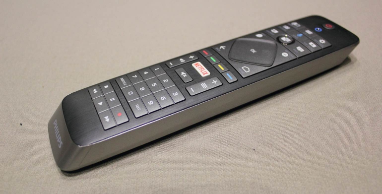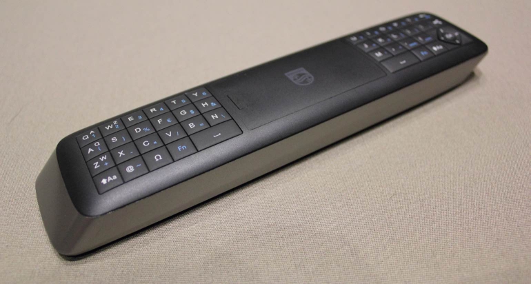 TP Vision voorziet de 65PUS7601 van dezelfde afstandsbediening als de andere topmodellen. Deze afstandsbediening is komt met de bekende twee zijden; een zijde voor de traditionele knoppen en een zijde met een volledig toetsenbord voor het invoeren van teksten. Het toetsenbord komt met wat kleine toetsen die weinig travel hebben maar het maakt het gebruik van onder meer de smart tv-functies een stuk eenvoudiger. Een webadres of zoekopdracht invoeren is een fluitje van een cent, met name ook omdat het toetsenbord in twee delen opgesplitst is waardoor het tikken met twee handen vlot gaat.