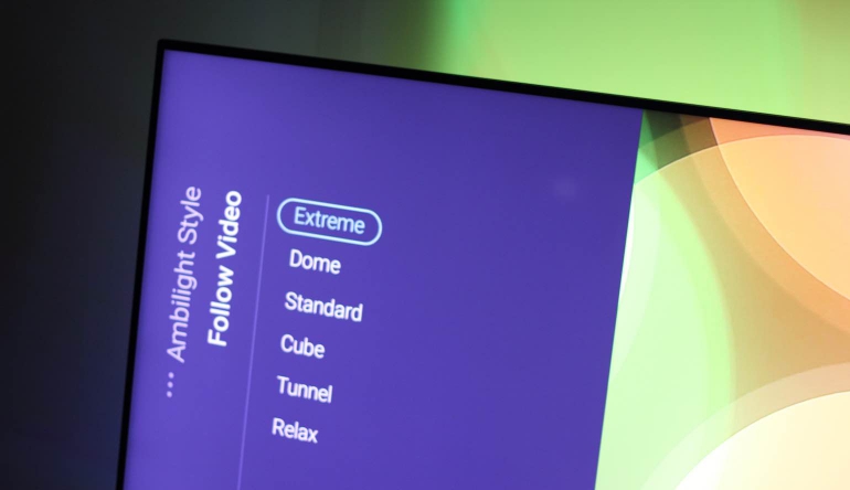 Er zijn echter verschillende AmbiLux modi op de tv te vinden waardoor je het naar eigen smaak in kunt zetten. Zo is Extreem de meest realistische en opvallende optie aangezien de projectie de actie nagenoeg letterlijk op je wand toont. De Relax-modus geeft iets minder scherpe beelden en komt rustiger over. Je kunt ook kiezen voor bepaalde effecten, waaronder de Dome-modus die een soort fish-eye weergave biedt, en de Cube-modus die een soort kubus-weergave met grote pixels biedt. Het ligt maar net aan de content die je kijkt en wat je smaak is. Wij hebben ervaren dat Extreem bij actiefilms prima werkt en niet snel afleidt, maar bij ‘rustige’ series of tv-programma’s is de Relax-modus een stuk fijner. Er is overigens ook een speciale modus waarbij de projectie reageert op muziek, en belangrijk om te weten is dat de techniek de zwarte balken onder en boven in beeld negeert, en je dus geen zwarte projectie boven je tv krijgt.