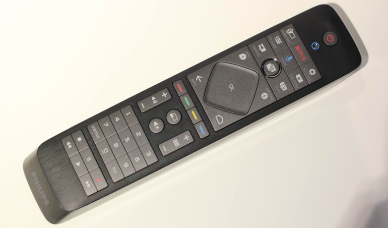 De afstandsbediening die Philips met dit model levert heeft een kleine make-over gehad. Hij lijkt iets groter en zwaarder geworden te zijn, wat positief is aangezien de accessoire nu prima in de hand ligt. De knoppen hebben wat meer ruimte gekregen, met name ook op het toetsenbord dat zich aan de achterzijde bevindt. Philips gaat niet mee in de trend van steeds kleinere afstandsbedieningen met touchvlakken, al bevindt zich wel een klein touchvlak aan de voorzijde waarop je kunt swipen. Dit swipen is eerder irritant dan handig. Het vlak is veel te gevoelig en aangezien hier ook de ‘normale’ knoppen in verwerkt zitten swipe je al snel onbedoeld door de instellingen van de tv heen. Afgezien van dit puntje is de afstandsbediening eindelijk weer eens een lekker aanvoelende forse accessoire waarmee je de tv comfortabel en snel kunt bedienen. Op de voorzijde zijn overigens weer snelkoppelingen voor Netflix, Android TV en Ambilight aanwezig.