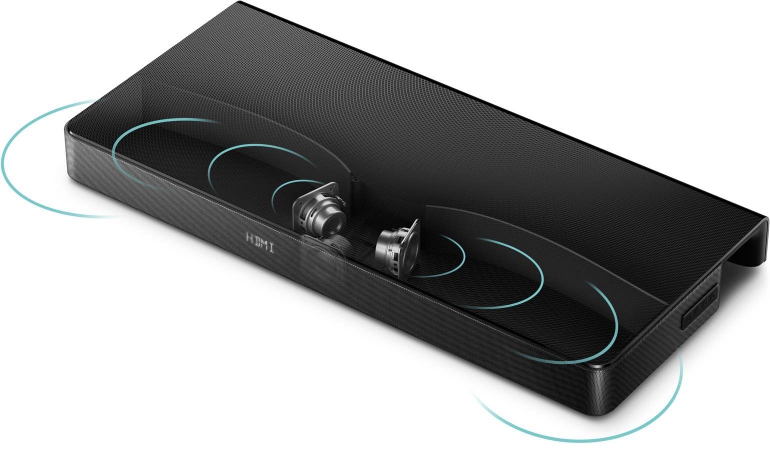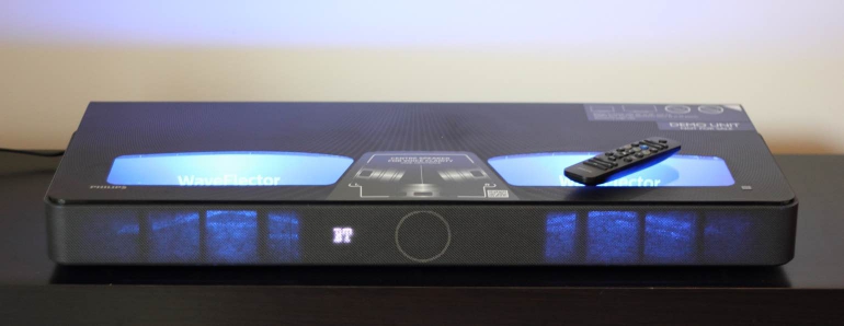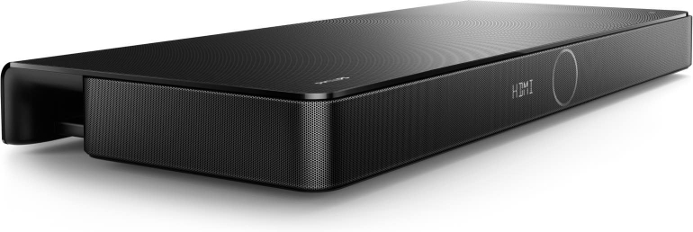 De speaker heeft een afmeting van 713 x 75 x 325 millimeter en weegt 4,5 kilogram. Volgens Philips moet elke tv tot 55-inch op de speaker kunnen staan. Qua design is er weinig bijzonders aan; je hebt te maken met een rechthoekige en platte speaker die voorzien is van een grijze grille aan de voorzijde. Achter de grille is een led-display met beknopte informatie verscholen.
