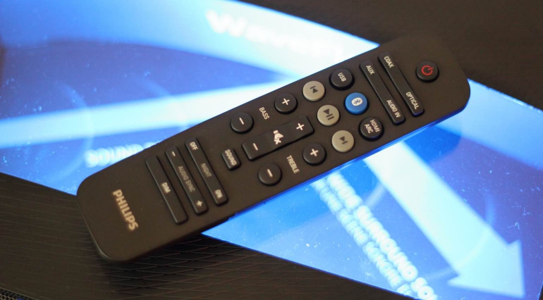 Verder is de HTL5130B uitgerust met een vermogen van 150 Watt, een hdmi-poort met ARC-ondersteuning, een optische en digitale coaxiale aansluiting voor digitale bronnen, een aux-input voor analoge bronnen, een mini-jack-aansluiting, en een usb 2.0-poort waarop een usb-stick (alleen voor MP3- en WMA-bestanden) aangesloten kan worden. De SoundStage wordt geleverd met een compacte afstandsbediening waarmee alle functies bediend kunnen worden. Zo kun je de input kiezen, de bass en treble aanpassen en de geluidsmodus kiezen.