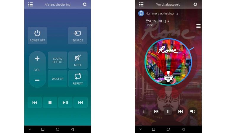Het is wat verrassend dan dat de HW-N650 dit alles loslaat. Je kunt wel muziek streamen naar deze soundbar, maar enkel via Bluetooth. Dat kan in relatief hoge kwaliteit, met ondersteuning van aptX. Het is ook via Bluetooth dat de Samsung Audio Remote-app werkt. De app is niet slecht, want je kunt het echt als volledige remote gebruiken. Ook om ingangen te schakelen, bijvoorbeeld. De app is eveneens een muziekspeler. Maar we vonden het wel spijtig dat je enkel muziekbestanden vanaf je eigen telefoon kunt streamen en niet bestanden die bijvoorbeeld via DLNA gedeeld zijn vanaf een NAS. Wil je dit doen, dan moet je werken met een mediaspeler-app van iemand anders. VLC bijvoorbeeld, of Goodplayer. Wij vinden BubbleUPnP ook wel lekker veelzijdig.