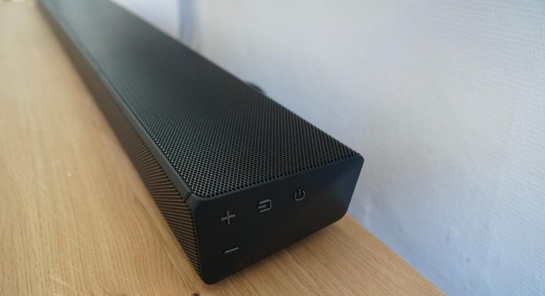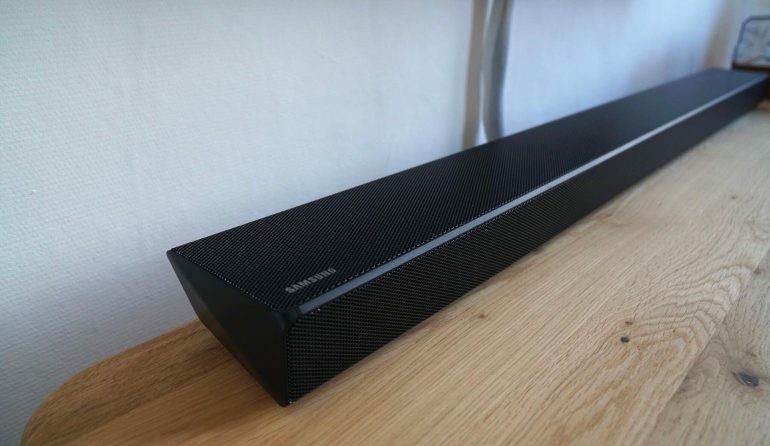Je ziet deze akoestische verspreider eigenlijk niet omdat het onder het rooster van de soundbar is gemonteerd, maar het is er wel. Door deze openingen komen vooral hogere frequenties. Het voordeel van Acoustic Beam is dat details en stemmen over de volledige lengte van de soundbar naar buiten komen, waardoor je een heel brede uitstraling krijgt. Vooral dialogen lijken uit heel het scherm te komen, in plaats vanuit het midden. Deze techniek – die we overigens ook al zagen bij de Philips B1-minisoundbar – is vrij effectief. Het verschil is dat bij de B1 een waveguide enkel werd gebruikt om geluid heel breed de kamer in te sturen, Samsung voegt er ook een stukje positionering van geluidseffecten en stemmen bij. Hierdoor zouden bijvoorbeeld dialogen vanaf de juiste plaats op het scherm komen. Vooropgesteld dat de bron-soundtrack juist in elkaar steekt, uiteraard.