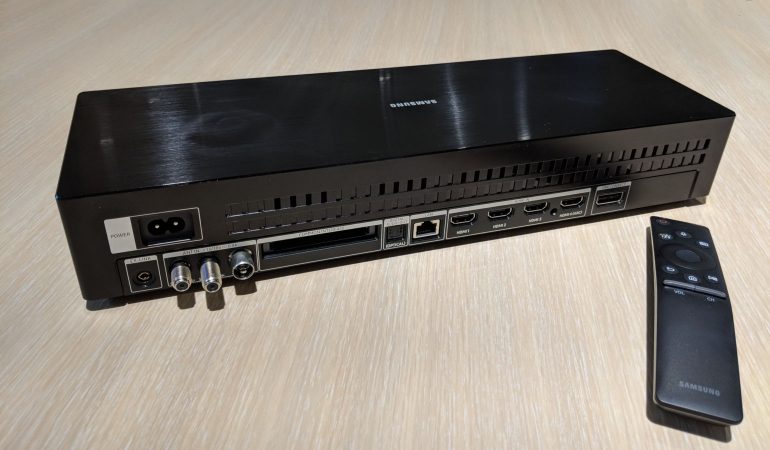 Bij de aansluitingen lever je absoluut niets in ten opzichte van de Q9FN. Alle aansluitingen zitten op de bijzonder lijvige One Connect box. Samsung heeft gekozen voor een passieve koeling, zodat de One Connect box volledig geruisloos werkt. We vinden vier HDMI-aansluitingen, allemaal klaar voor Ultra HD en HDR, een digitaal optische uitgang, en drie USB-aansluitingen aan de zijkant. Tot slot zijn er drie antenne-aansluitingen, de bedrade netwerk aansluiting en de stroomvoorziening. Er is geen hoofdtelefoonaansluiting, maar de televisie beschikt wel over Bluetooth.