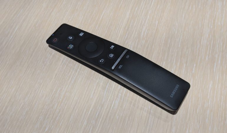 In plaats van de luxueuze lichtmetalen remote van de Q9FN krijg je de ‘gewone’ Smart Remote controller. De remote werkt met Bluetooth dus richten is geen verplichting. Die is uitgevoerd in zwart plastiek en is licht gebogen. Hij licht goed in de hand, en de knoppen zijn makkelijk te vinden door hun zacht reliëf. De combinatie met de Smart Hub zorgt er voor dat je zelden het gevoel hebt dat er te weinig toetsen zijn.
