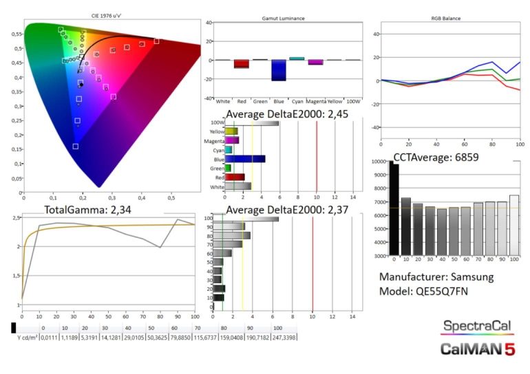 Zoals de andere Samsung toestellen die we dit jaar al zagen verbergt de Q7FN in de film mode iets te veel zwartdetail. Je verbetert dat door de gamma-waarde te veranderen naar 1 (of zelfs 2 als je echt bij veel omgevingslicht kijkt). Het beeld is al bijzonder helder, en heeft in de helderste tinten de neiging die nog helderder te maken waardoor de grijsschaal daar iets te koel (lichte cyaan tint) wordt.