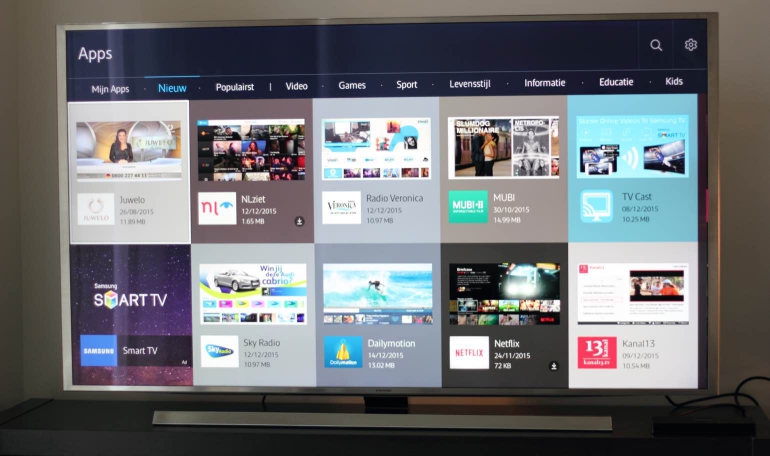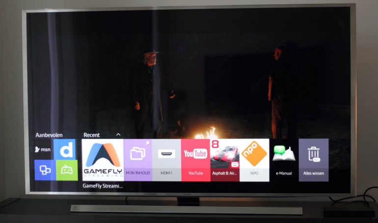 Wanneer je de UE55JS8000 voor het eerst aanzet krijg je de meest belangrijke instellingen en opties te zien zodat je direct van start kunt. Zo moet je het netwerk koppelen om van de internetdiensten gebruik te maken, kun je naar zenders laten zien en moet je een Samsung-account aanmaken om van alle smart tv-mogelijkheden gebruik te maken. De navigatie binnen het smart tv-platform, Tizen genaamd, verloopt ook soepel. We hebben geen last gehad van lags of vertragingen en er zit een duidelijke structuur in. Ook het schakelen tussen apps gaat lekker vlot, net als het bladeren door app-lijsten en menu’s.