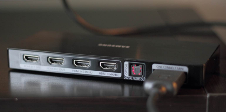 De UE55JS8000 is voorzien van de One Connect Mini-box waarop de meeste aansluitingen zich bevinden. Zo kun je apparatuur op deze box aansluiten en hoef je niet meer achterop de tv te zijn. De box komt met twee usb 2.0-poorten, vier hdmi 2.0-aansluitingen, een optische aansluiting en een aansluiting om de box met de tv te verbinden. Achterop de tv zelf zien we nog een CI+-slot, een usb 3.0-poort, een ethernetpoort en component- en composiet-aansluitingen terug.