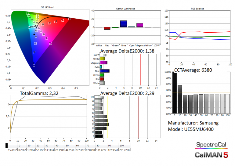 Het schermt is bijzonder goed gekalibreerd. Enkel de grijsschaal toont ruimte voor verbetering. De kleurtemperatuur is een tikje te warm, behalve in de donkerste tinten waar hij te koel is. De fout ligt op de grens van wat zichtbaar is, dus je zal er nauwelijks iets van merken. Het kleurbereik en de kleurweergave zijn uitstekend. Deze Samsung toont erg natuurlijke beelden, met nauwkeurige huidstinten en levendige kleuren.