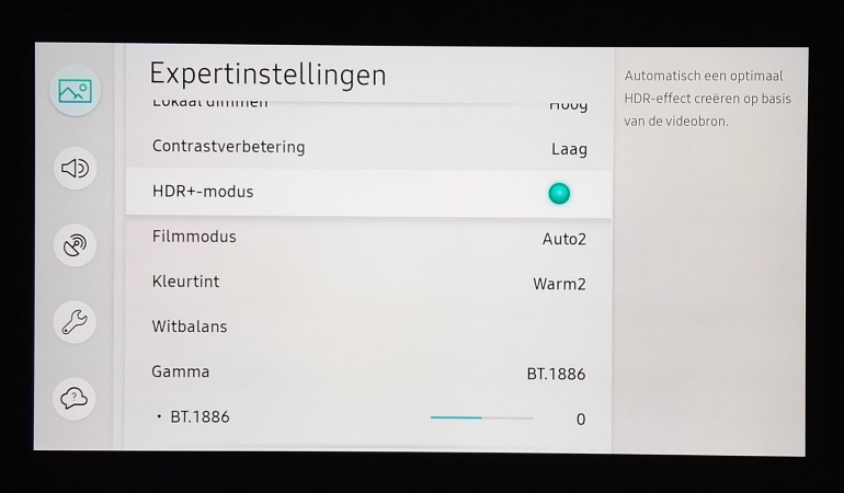 In de expertinstellingen van het beeldmenu kan je HDR+ activeren om je SDR-content een HDR-tintje te geven. Die keuze maakt beelden iets helderder, het is een keuze die je kunt overwegen als je bij veel licht kijkt.
