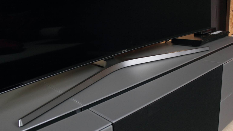 De zilveren afwerking zien we ook in de chromen voet terug, al is het deze keer een matte afwerking. Voor het koppelen van de voet is een montagepunt in het midden achterop de tv geplaatst. Dit zorgt ervoor dat je onder geen koppeling tussen tv en de voet ziet, wat de tv weer – soort van – laat zweven voor de standaard. Maar, het zorgt ook voor een tv die vanaf alle kanten fraai vormgegeven is, zelfs vanaf achteren gezien. Het is echter wel een forse standaard en het scherm kan niet draaien op de voet. Al met al is de Samsung UE65KS9500 een premium ogende tv met een strakke en simplistische afwerking en een goede bouwkwaliteit. Het is een chique model dat in menig huiskamer niet zal misstaan en ook in onze thuisbioscoop (in aanbouw) weet de tv zijn plek prima te vinden.