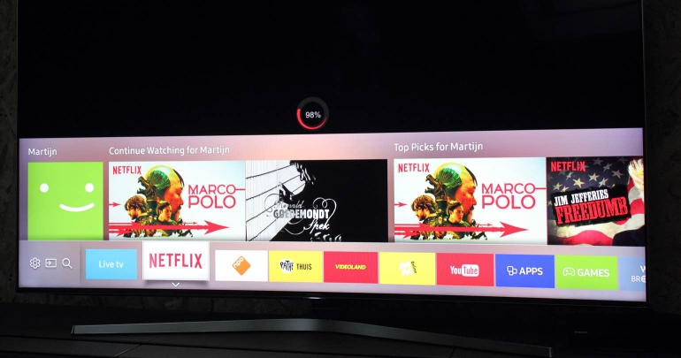 De Samsung UE65KS9500 is net als de meeste tv’s in het assortiment van Samsung voorzien van Tizen. Tizen is het smart tv-platform van Samsung en een drastische verbetering ten opzichte van de smart hub van een aantal jaar terug. In de afgelopen twee jaar heeft Samsung Tizen weten te verbeteren en dat resulteert nu in een vrij simpele maar bijzonder handige en gebruiksvriendelijke smart tv-interface.