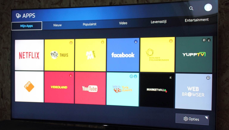 Vanuit de waaier kun je ook naar de app-bibliotheek van Samsung, de plek waar je nieuwe applicaties kunt ontdekken en kunt installeren. Hier stuiten we echter op een minpuntje want ten opzichte van twee jaar terug is het app-aanbod vrij minimaal. Ja, de belangrijkste apps zijn aanwezig maar populaire apps als NPO Gemist, Pathé Thuis en Nu.nl ontbreken in de bibliotheek. Aangezien Samsung op dit vlak voorop liep mogen we aannemen dat er achter de schermen hard gewerkt wordt om dit weer op niveau te krijgen.