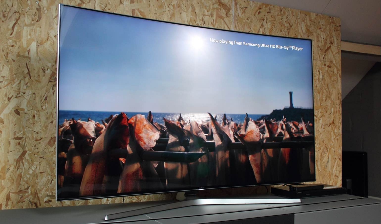 Op het gebied van kijkhoeken hebben we eigenlijk altijd wel wat te zeggen wanneer we naar een gebogen scherm kijken maar toch moeten we deze keer toegeven dat hier nauwelijks iets van te merken is. Samsung heeft het voor elkaar gekregen om sowieso binnen een hoek van 90 graden een prima plaatje voor te kunnen schotelen. Ga je nog meer uit het midden zitten, ja dan heeft het va-paneel iets meer moeite om de strakke kleurweergave en hoge helderheid te behouden. Ook vallen hierbuiten halo-effecten wat meer op, maar niets om echt over te struikelen. Reflecties zijn nog altijd zichtbaar al wordt het door een nieuw filter wat geminimaliseerd. Als de tv naast een raam staat is de weerspiegeling duidelijk zichtbaar maar een gedimde lamp achterin de kamer of zonlicht van een raam aan de andere kant van de kamer vallen niet op. Het blijft echter zo dat een gebogen scherm in onze optiek iets gevoeliger is voor reflecties dan een flatscreen.