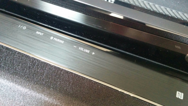 Aan de achterkant van de soundbar zitten enkele, kleine knopjes die je kunt gebruiken in plaats van de afstandsbediening. Die gebruikte ik vrijwel nooit, maar het is goed om te weten dat ze er op zitten. Op de bovenkant vind je de locaties voor de knopjes. Die zijn netjes weggewerkt. Verder heeft de HT-CT780 op de achterkant drie HDMI-aansluitingen, een HDMI-in en natuurlijk een aansluiting voor de optische kabel, plus aan de voorkant een display achter de stof, zogezegd, die in die verschillende niveaus je handelingen weergeeft.