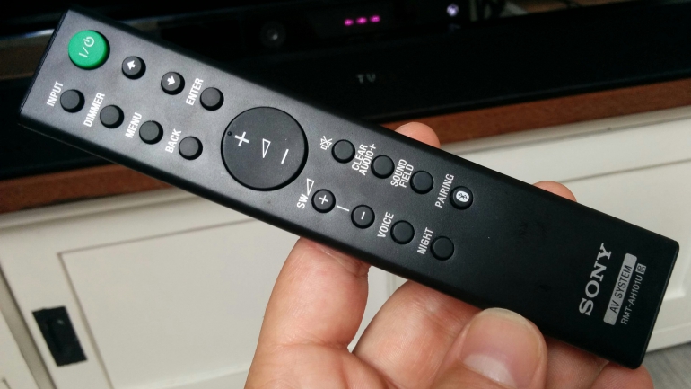 Waarom Sony dan toch gekozen heeft voor een optische kabel heeft misschien te maken met het idee dat veel mensen toch liever hun apparatuur apart aansluiten, zodat ze niet altijd afhankelijk zijn van, in dit geval, een soundbar. Afijn, genoeg over die kabels. Want er is nog een object te bespreken: de afstandsbediening. Dat is een kleine, smalle afstandsbediening met daarop alle functies voor het instellen van de subwoofer – functies die zowel direct te gebruiken zijn als functies die je nog even moet opzoeken in het enkele menu van de bar.