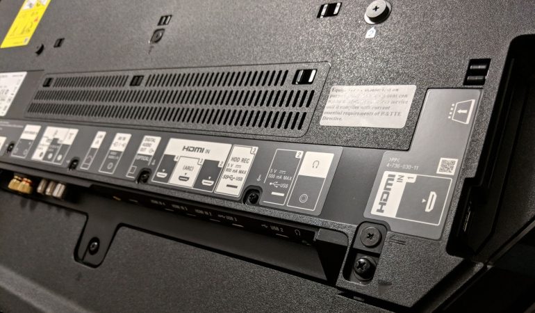 Hou er rekening mee dat de aansluitingen centraal achter het toestel staan, omdat ze op de voet zitten, niet op het scherm. Ze staan ook onderaan op de voet, en dat betekent, zeker bij dit 65 inch scherm, dat ze niet makkelijk te bereiken zijn, eens het toestel opgesteld is. Dat geldt bijvoorbeeld zeker voor de hoofdtelefoonaansluiting. Sony plaatste links aan de zijkant van de voet een HDMI-aansluiting en rechts een USB-aansluiting. Die zijn gelukkig wel vrij gemakkelijk te bereiken. Wie regelmatig die aansluitingen gebruikt, kan natuurlijk altijd een verlengkabel ingestoken laten.