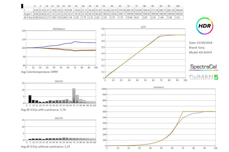 Sony ondersteunt HDR10, Dolby Vision en HLG. De kalibratie in de Gebruiker mode is erg goed, maar moet (net als de ZF9) nipt de duimen leggen voor de Panasonic FW950 voor nauwkeurigheid bij kleurweergave. De AF9 volgt de vereiste PQ –curve perfect tot 400 nits, en rolt dan mooi af om alle mogelijk witdetail te tonen.