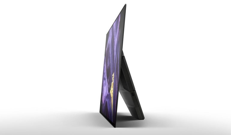 Het scherm heeft een zwart glossy metalen kader dat vooraan een millimeter breed is. De steun achteraan is een zwaargewicht, niet enkel omdat hij voor stabiliteit moet zorgen, maar ook omdat er een flinke audio-oplossing in zit. Sony heeft de montage aanzienlijk vergemakkelijkt vergeleken bij de A1. Je moet nog steeds één deel onderaan de steun monteren, maar door zijn eenvoudige constructie en twee bijgeleverde rubber voetjes waarop het scherm tijdelijk staat, is dat snel geklaard.