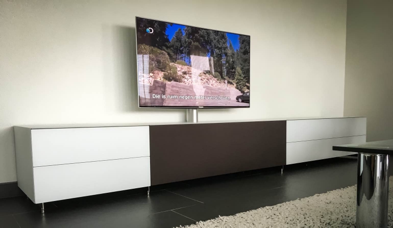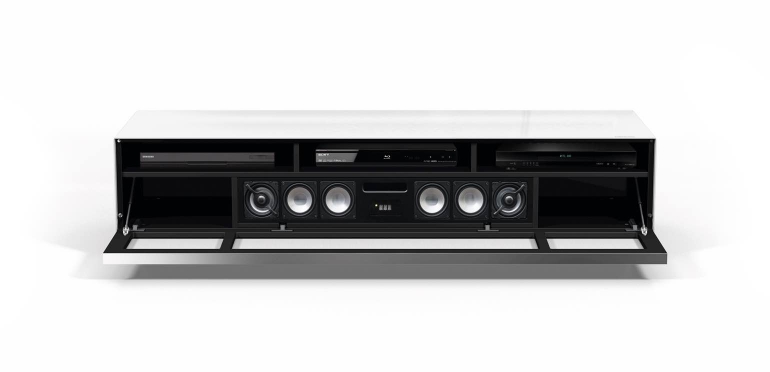 We kunnen niet elk meubel uitlichten, zeker niet omdat bij veel meubels je ook nog eens uit verschillende materialen, afwerkingen en combinaties kunt kiezen. Wij hebben in deze review in ieder geval gebruikt gemaakt van het Cocoon-meubel. Dit meubel kan ook weer in verschillende combinaties gekocht worden maar we hebben de variant met een middenstuk met stoffen bekleding (waarachter zich de soundbar bevindt) en twee witte elementen aan de zijkant, voorzien van een glazen witte klep. Deze zijden zijn voorzien van een glazen plaat die de bovenste helft van de onderste helft scheidt en je zo ruimte geeft voor apparatuur, dvd’s of wat je ook wilt opbergen. Natuurlijk zijn hier ook weer aanpassingen mogelijk; zo kun je kiezen voor een lade in plaats van een klep. Het deel waarin de soundbar geplaatst is, is voorzien van een speciaal inbouwframe, waardoor er aan de zijden van de soundbar een kleine ruimte is voor bijvoorbeeld cd’s en dvd’s, en je boven de soundbar je mediaspeler en mediabox kwijt kunt. Een nette en eenvoudige oplossing om al je apparatuur weg te werken. Het is echt een alles in één installatie, en al helemaal wanneer je ook nog eens een tv-standaard op de kast laat zetten waardoor je tv-hoek echt één geheel wordt en compleet ingericht is.