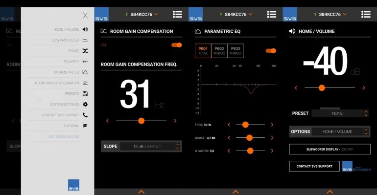 Tijdens de testperiode werd de SB-4000 ingezet met surroundopstellingen gebouwd rond onze vaste speakeropstelling met Dali Rubicon LCR-luidsprekers en met een Denon AVR-X6300 (onze vaste testreceiver) en op een ander tijdstip met een nieuwe Onkyo TX-RZ830 waarover we in de toekomst een recensie publiceren. De SB-4000 integreren in je surroundopstelling is niet uitdagender dan bij een reguliere subwoofer. Het verschil is dat je via de SVS-app een niveau van finetuning hebt dat bij anderen meestal ontbreekt. Via de parametrische equalizer kun je op drie punten een frequentie boosten of wegdrukken, met een instelbare Q-breedte. Drie banden lijken ons meer dan voldoende, want je grijpt enkel in op een bescheiden frequentiebereik tot circa 300 Hz. Als er meer correcties nodig zijn, is het wellicht een beter idee om eerst de ruimte akoestisch te behandelen. Deze functies, net zoals instellingen als fase, polariteit en low pass filter, gebruik je wellicht enkel bij het installeren van de sub. Hetzelfde is waar voor de Room Gain Compensation, waarbij je compenseert voor een felle of doffe ruimte.