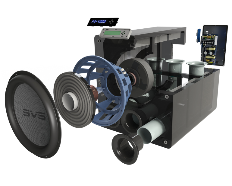 Over het uitpakken gaan we het niet echt hebben. Zorg gewoon dat er een tweede persoon aanwezig is die je kan helpen bij het opstellen, want anders breng je jouw rug en mogelijk je leven in gevaar. Door zijn formaat van 46,5 x 45 x 53 cm en gewicht van 46,5 kg is dit geen subwoofer voor een doorsnee woonkamer, maar echt een high-end product voor heuse thuisbioscopen en ultieme gaming rigs. Je moet zijn afmetingen trouwens ergens ook wat relativeren, want de SB-4000 is een trickle-down versie van de nog grotere SB16-Ultra met zijn 15,6-inch woofer en 1.500 Watt (reële) vermogen. Het nieuwe apparaat bevat veel van de technologie van die spectaculaire subwoofer, zoals de MOSFET klasse D-versterker en het Analogue Devices DSP-gedeelte. De SB-4000 bevat een forse 13,5 inch woofer met een behoorlijk grote slag, groot maar toch nog compacter dan de SB16-Ultra. Om die enorme driver te sturen is een dubbel magneetsysteem voorzien, dat met een gewicht van 18 kg verantwoordelijk is voor een significant deel van het totaalgewicht. Volgens SVS wekt deze driver bassen op van 19 tot 310 Hz, ± 3 dB. Dat is een ondergrens waarbij je het laag niet meer hoort, maar wel voelt.