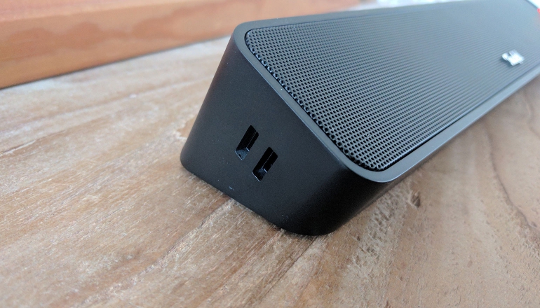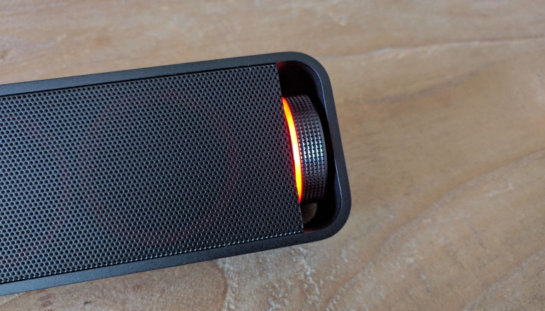 De volumeknop werkt zoals je zou verwachten. Door naar boven te scrollen verhoog je het volumeniveau. En door omlaag te scrollen, verlaag je dat niveau. Dat is allemaal niet zo bijzonder. Wat de speaker wel iets unieks meegeeft, is het hellende design. De speaker staat in een hoek van 35 graden en kan daardoor bijvoorbeeld gemakkelijk op een bureau geplaatst worden, waardoor de muziek direct op de luisteraar wordt afgevuurd. Ook is het zo dat die led-streep op de volumeknop kan aangeven dat de accu, van 2400mAh, bijna toe is aan een oplaadbeurt.