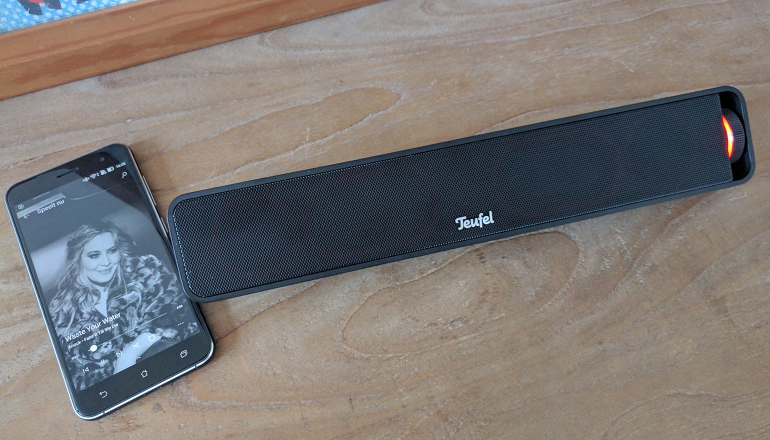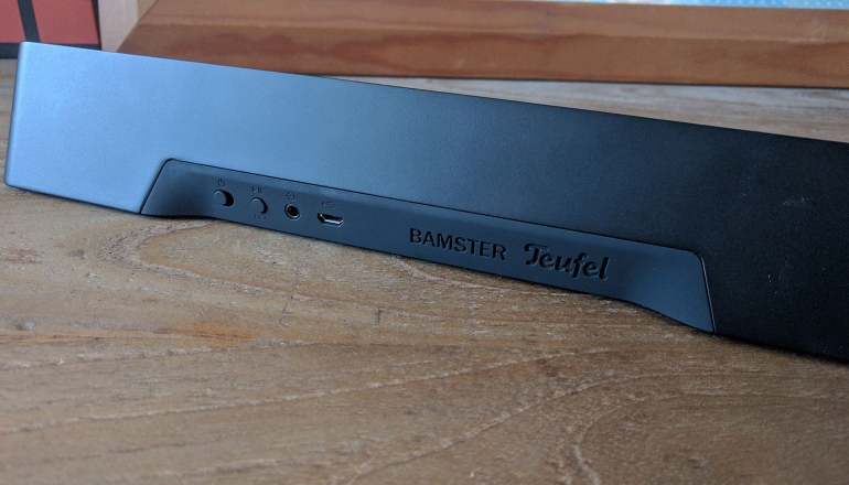 Naast een compact doch langwerpig design, beschikt de Teufel Bamster ook over slechts twee knoppen. Er is een schuifknop om het apparaat mee aan en uit te zetten en met de andere knop zet je de muziek op pauze en op play, kun je de bluetooth-verbinding activeren, koppel je er nog een andere Teufel-speaker aan én kun je naar het volgende nummer gaan. De tonen in het midden en het hogere segment komen goed naar voren in de Bamster, maar het basgeluid klinkt een beetje gedempt. Oh en met de accu, die ruim tien uur meegaat, zit het ook snor.