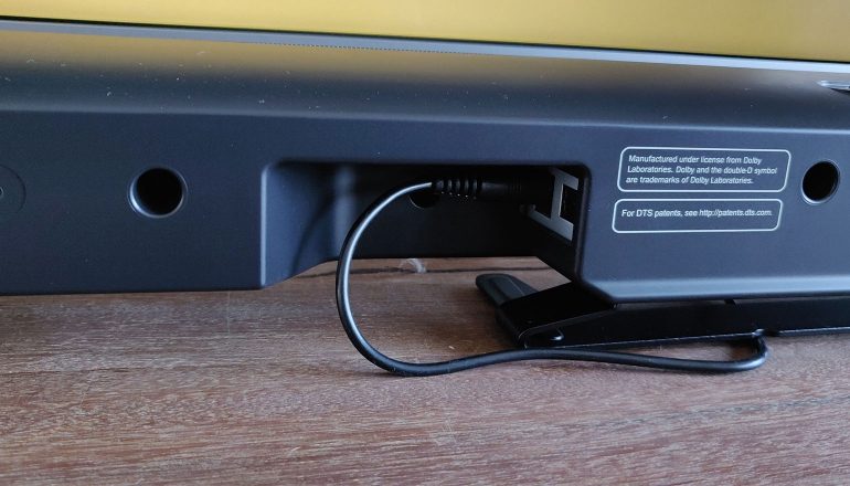 Dat ziet er niet heel aantrekkelijk uit. Het is goed om te weten dat je de soundbar ook kunt ophangen aan de muur, aangezien daarvoor gaten aanwezig zijn. Je kunt de kabels zodoende mogelijk iets beter wegwerken (maar er helemaal van afkomen lukt vrijwel nooit). Bovenop treffen we vier knoppen aan: bron uitkiezen, volume omhoog, volume omlaag en de aan-en-uitknop. Voor het aanzicht oogt dit misschien niet heel luxe, maar voor het praktische nut is het fijn dat de knoppen goed bereikbaar zijn. Dat geldt ook voor de aux-aansluiting.