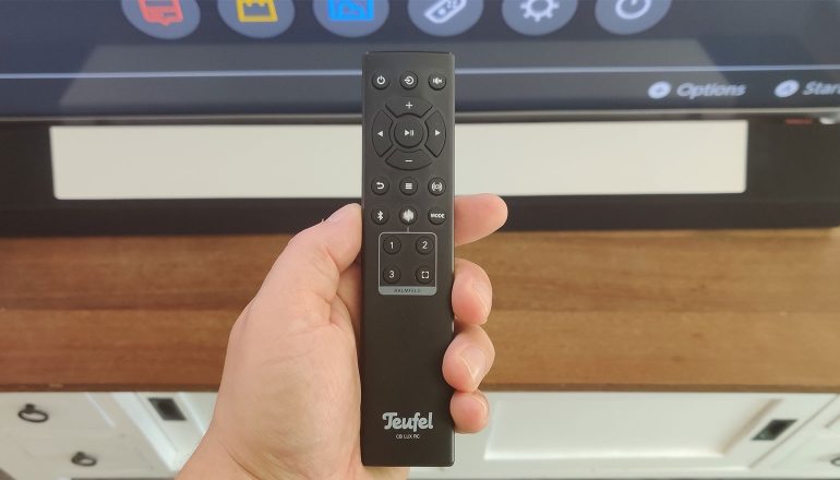 In het gebruik hebben we gemerkt dat de afstandbediening er soms een aantal extra seconden over doet om verbinding te maken met de soundbar. Wanneer je, als de soundbar net aanstaat en al werkt, op de knoppen drukt, dan zit er vertraging in de verwerking. Dat probleem lost zichzelf op, dus zorg ervoor dat je niet op allerlei knoppen gaat drukken wanneer het even duurt. Al die commando’s worden namelijk onthouden en komen later aan, waardoor de Teufel Cinebar Lux dus ogenschijnlijk vanuit het niets vreemde dingen kan gaan doen.