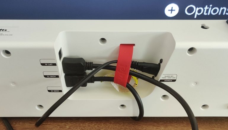 De Teufel Cinebar Lux is een brede soundbar van 105 centimeter breed. Afhankelijk van je televisie kan het zijn dat de soundbar daardoor niet perfect voor je tv past. Wij hebben hem getest onder een Philips-tv van 55-inch die op pootjes staat. En door de breedte van de soundbar, past die er niet precies tussen. Daardoor ontstaat er een opening tussen de soundbar en de tv, waardoor draden zichtbaar zijn. Het is niet het grootste probleem in de wereld en het is echt afhankelijk van de tv — maar we zien liever die dradentroep niet die daar achter hangt.