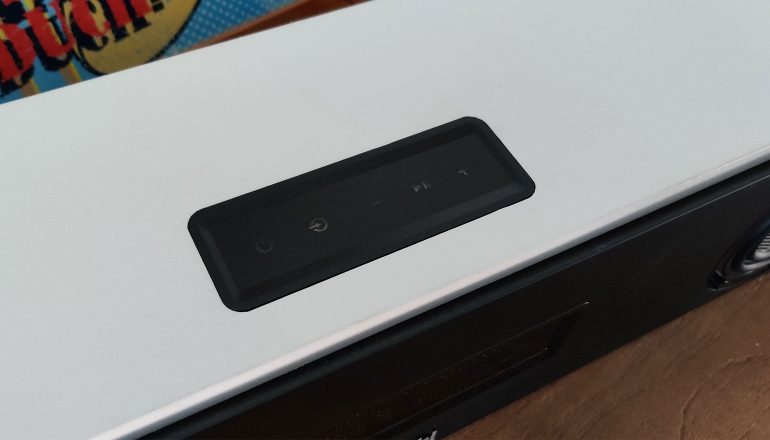 De andere vier drivers zijn twee frontfiring speakers en twee bassdrivers, zodat je ook geen aparte subwoofer hoeft aan te sluiten. Aan boord zit verder een klasse d-versterker, met een totaal vermogen van 380 watt. Bovenop zit een handig bedieningspaneel, voor basale functies, terwijl voorop nog een ledscherm zit met felle, rode cijfers en letters. Verder is er hdmi-in, hdmi-arc, usb, bluetooth met aptX, een optische aansluiting en een cinch-ingang voor stereo. Ook kan de soundbar signalen in 4k en hdr doorsturen naar de tv.