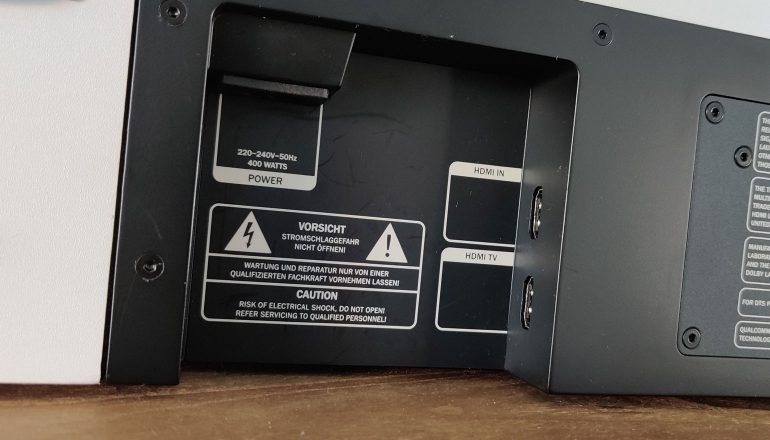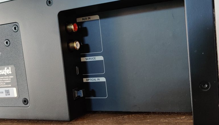 De installatie van de Teufel Cinebar Ultima verloopt minder soepel dan we gewend zijn. De aansluitingen zitten in een opening aan de achterkant. Ze zitten niet rechtstreeks op de achterkant, maar aan de zijkant van die opening. Daardoor is het een vervelend karwei de kabels op de juiste plek te krijgen. Het gaat niet vanzelf: soms moet je een specifieke kabel onder een andere door laten gaan, want anders is er niet genoeg ruimte, Gelukkig doe je dit – als het goed is dan – maar één keer, maar dan nog kan het gemakkelijker.