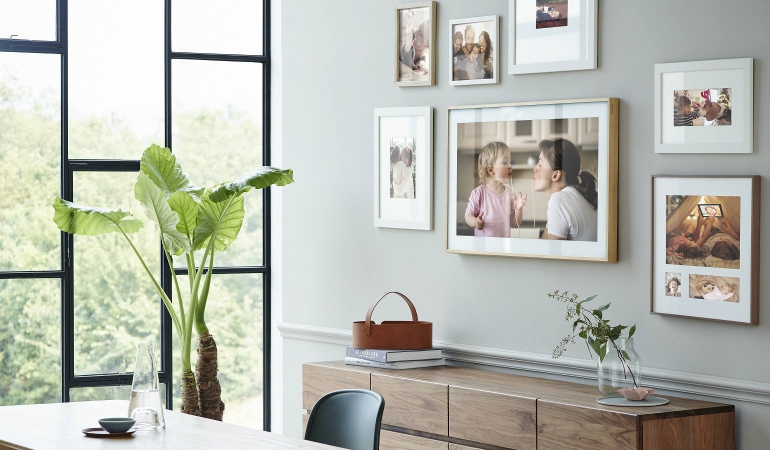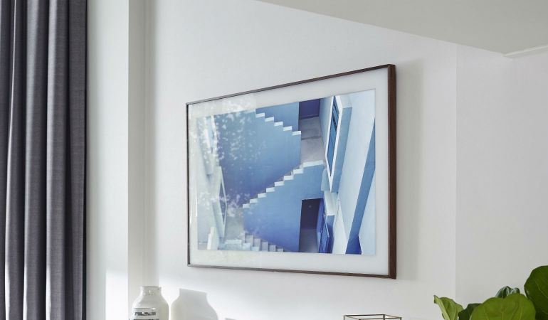 The Frame bevat namelijk meer dan honderd digitale kunstwerken om uit te kiezen, met categorieën zoals architectuur, landschappen en natuur, maar je kunt ook eigen foto’s (zie boven) en afbeeldingen toevoegen. Om het toestel nog persoonlijker te maken, kan de gebruiker ook kiezen uit verschillende typen en kleuren passe-partouts en lijsten. Tevens is er een optionele Studio Stand en ondersteuning voor de eerdergenoemde Invisible Connection en No Gap Wall mount.